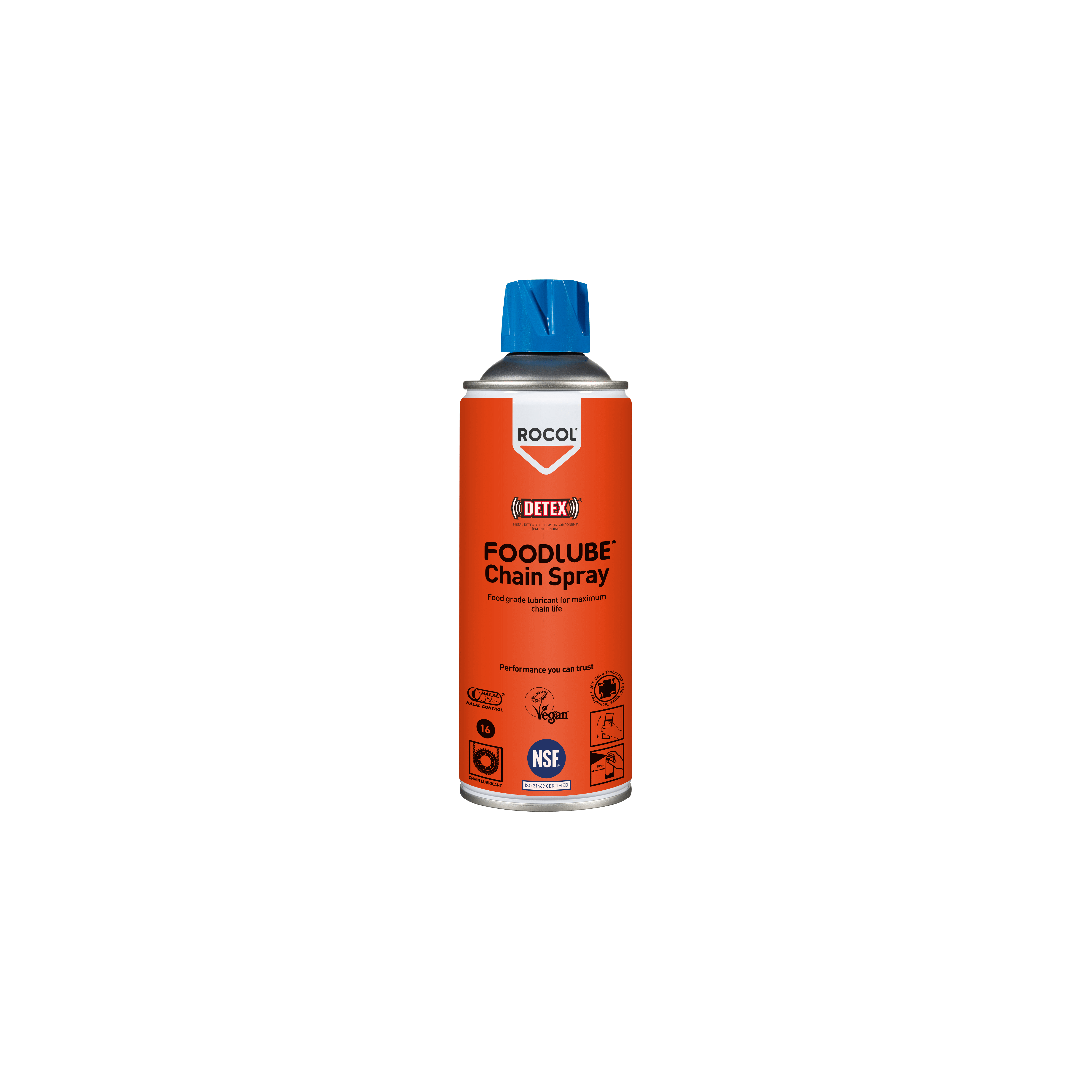 - FOODLUBE® Chain Spray es un aerosol lubricante no tóxico y resistente al agua, diseñado principalmente para la lubricación efectiva de todo tipo de cadenas y transportadores.